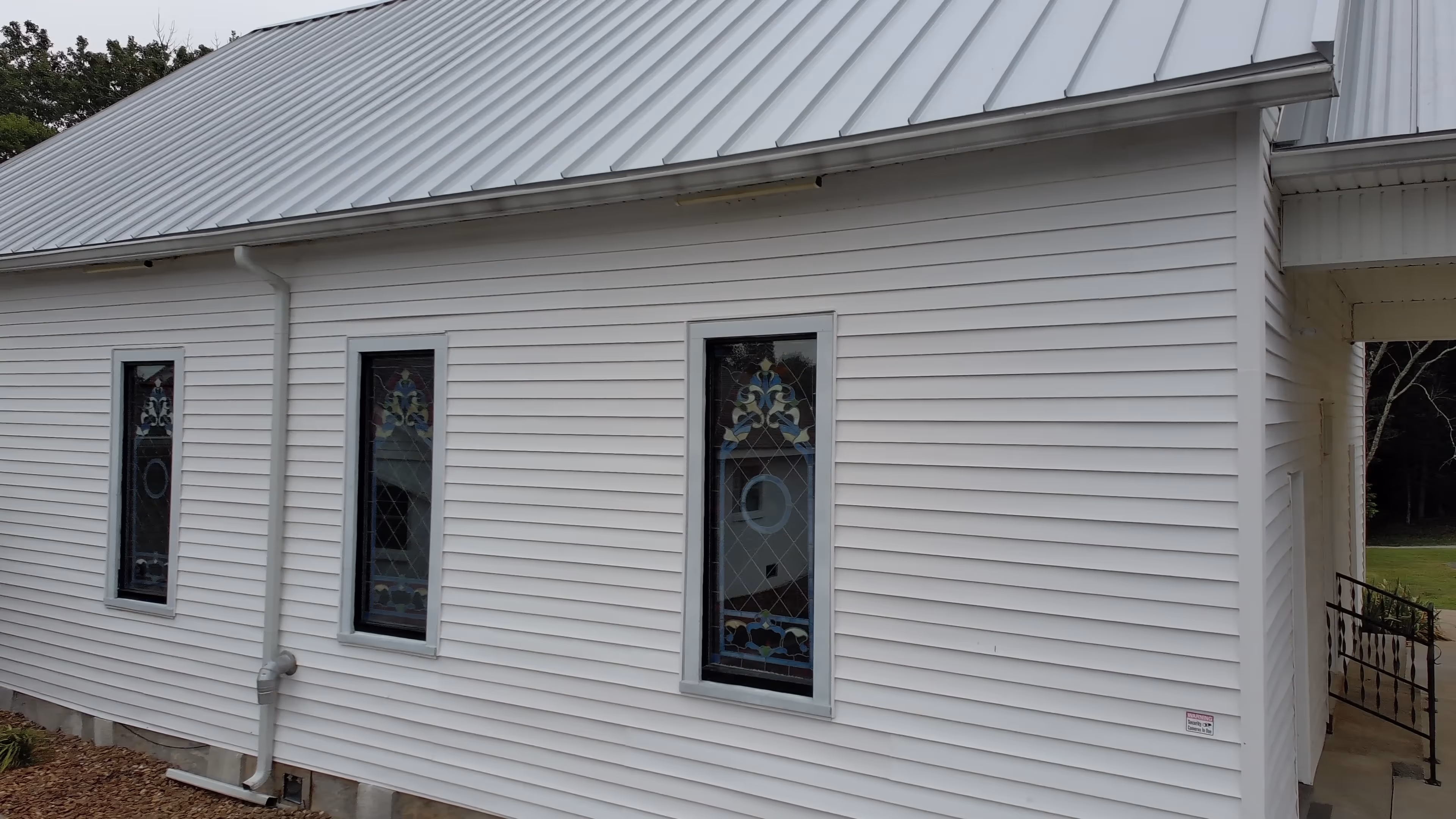 Before tear-off we covered every window from the inside and kept them covered until final cleanup. The roof decking under the old metal was original to the sanctuary and right at a hundred years old, so we checked every board, re-nailed what was sound, and replaced only the pieces that were past service so the new panels had a solid base. Panels were formed to length and installed in long runs to the ridge with clean rakes and hemmed eaves. The site was magnet-rolled several times each day and again at the end so no fasteners or chips were left on the walks, grass, or parking.