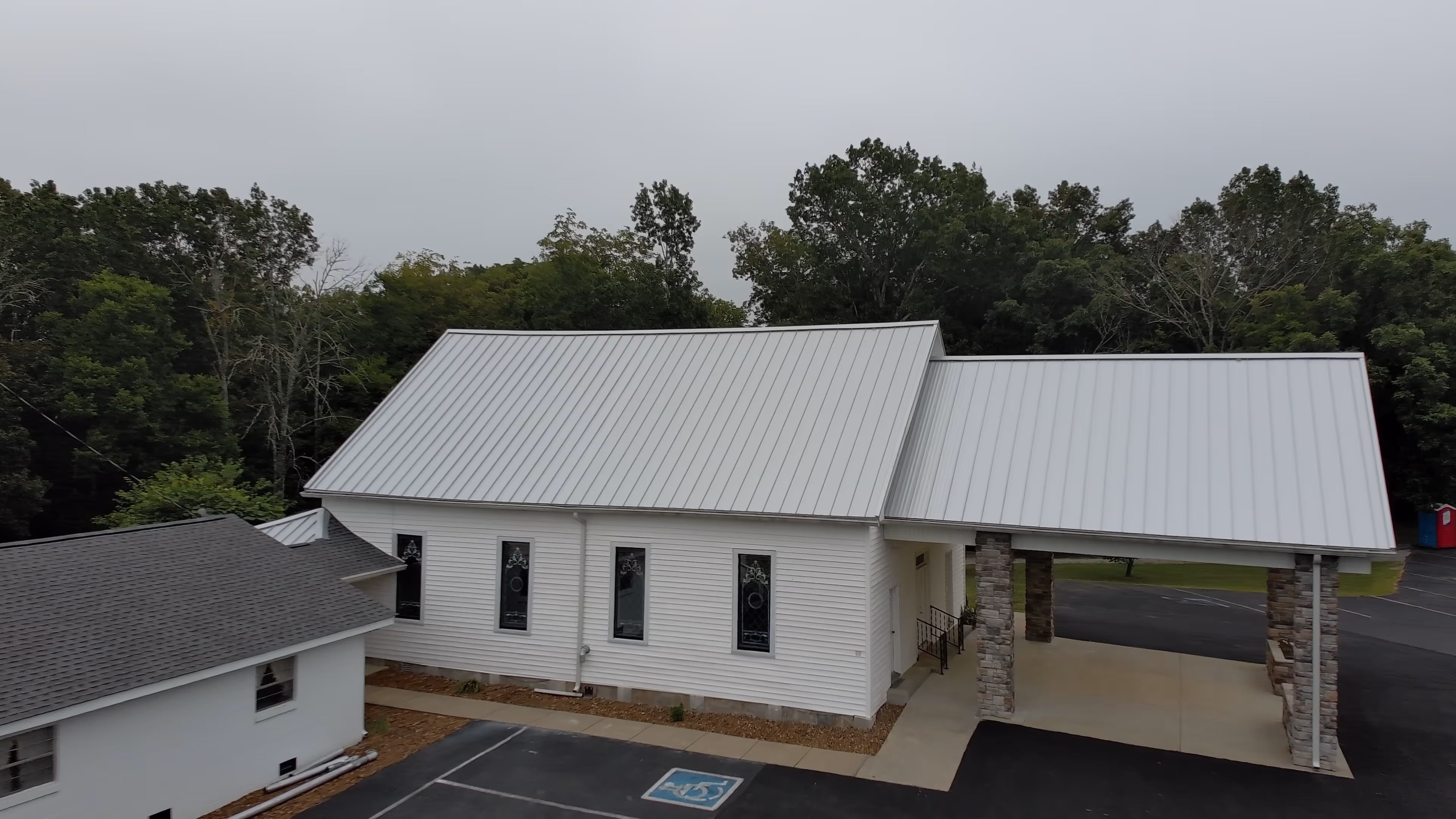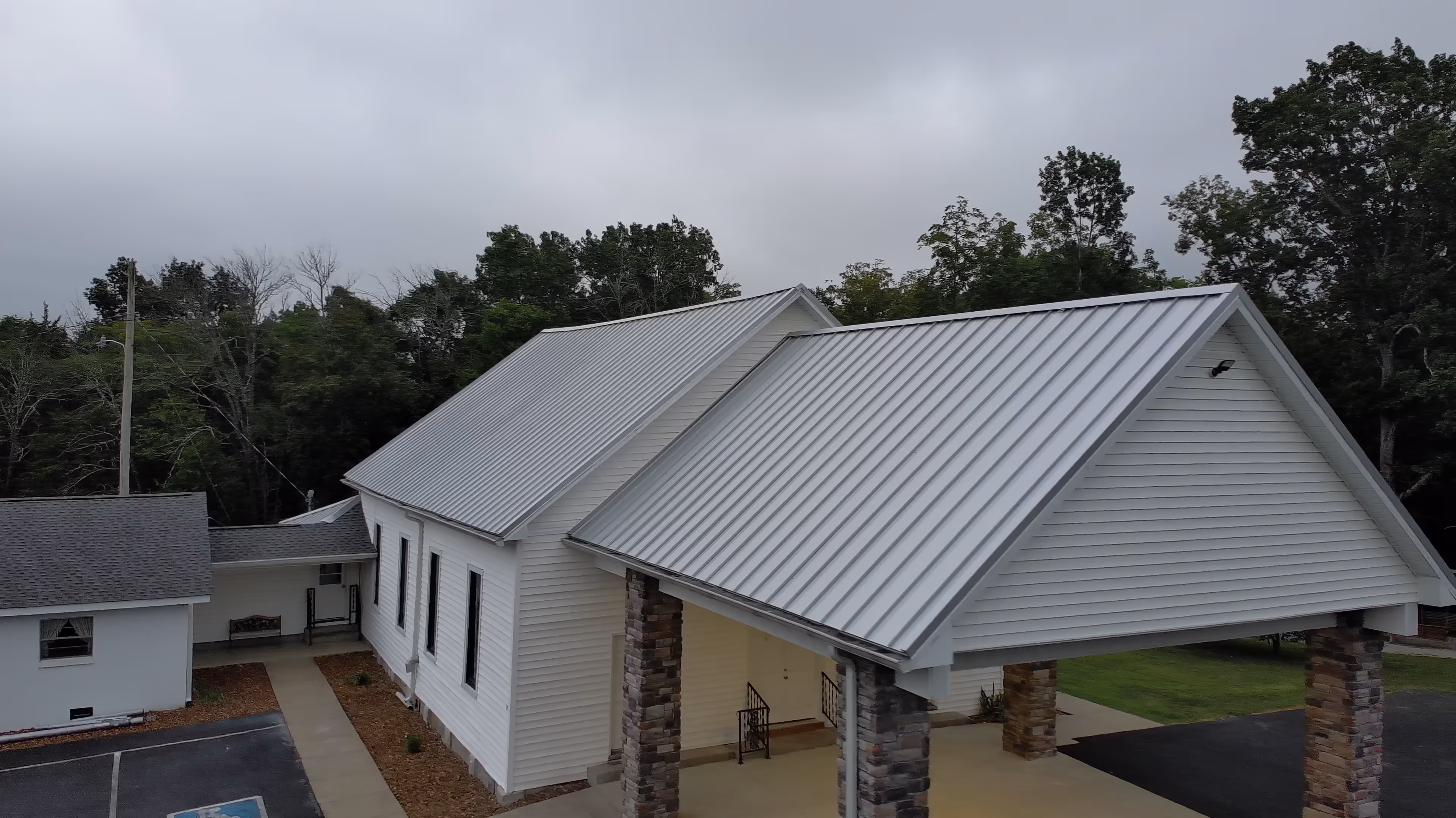 We installed silver standing-seam panels in long runs from ridge to eave so the sanctuary reads straight from the parking lot. Panels were formed to length, seams lock tight, and fasteners are concealed. Rakes are trimmed tight, eaves are hemmed for a clean shadow line, and the ridge cap sits low so the profile stays simple. At the covered drop-off we tied the new metal into the adjoining roofs with clear transitions and drip edges that sit flush with the fascia. The result is a bright, even roofline that respects the old windows and fits the quiet look of the place.
