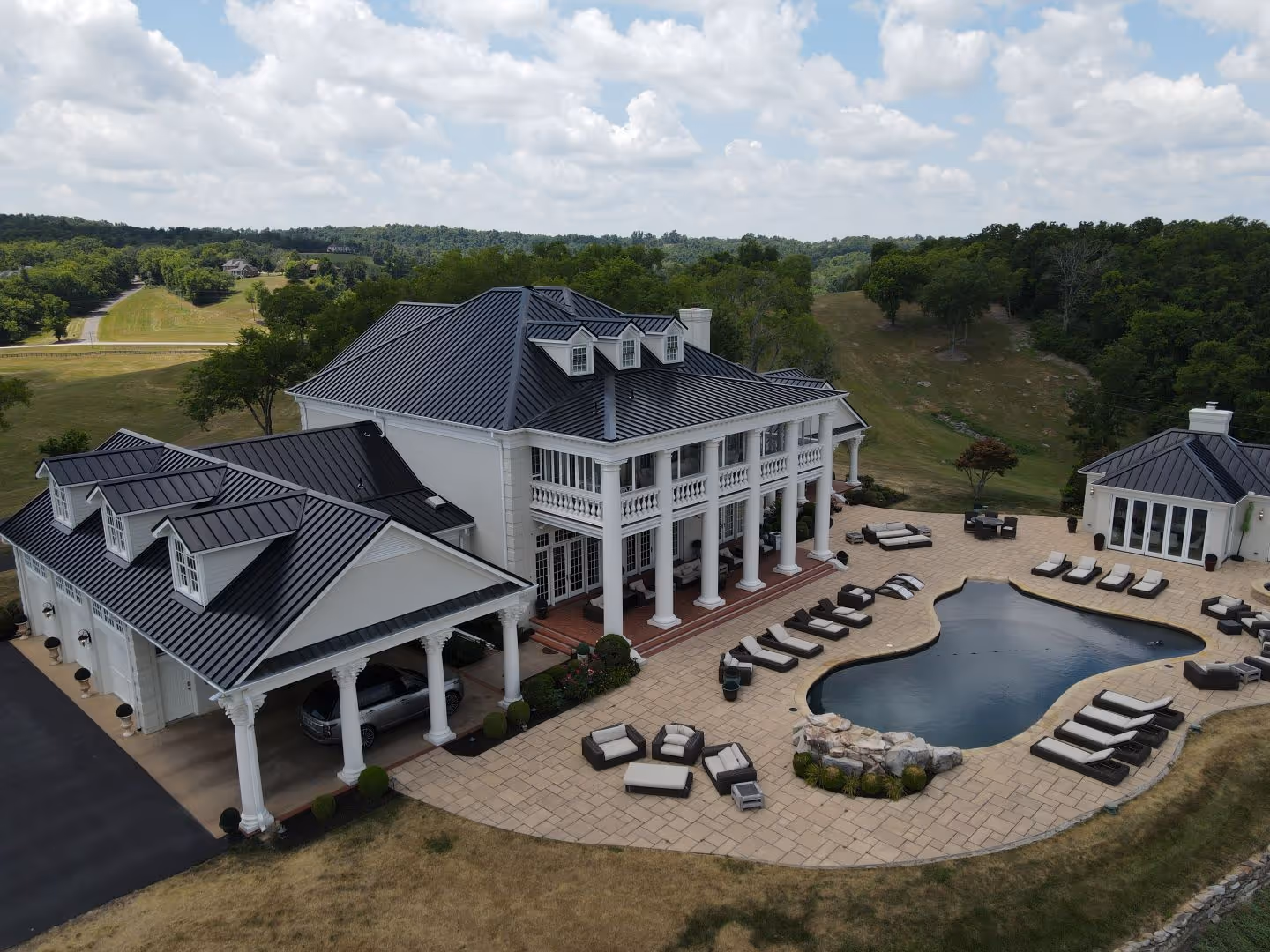 We installed black standing-seam panels formed to length and run ridge to eave on every plane. Seams track clean through hips and breaks so the pattern stays calm across the complex geometry. Ridges sit low, rakes throw a crisp shadow, and eaves finish with hemmed edges. Gutters and downspouts are color-matched, so the fascia reads straight from corner to corner and the portico trim stays in charge of the front.