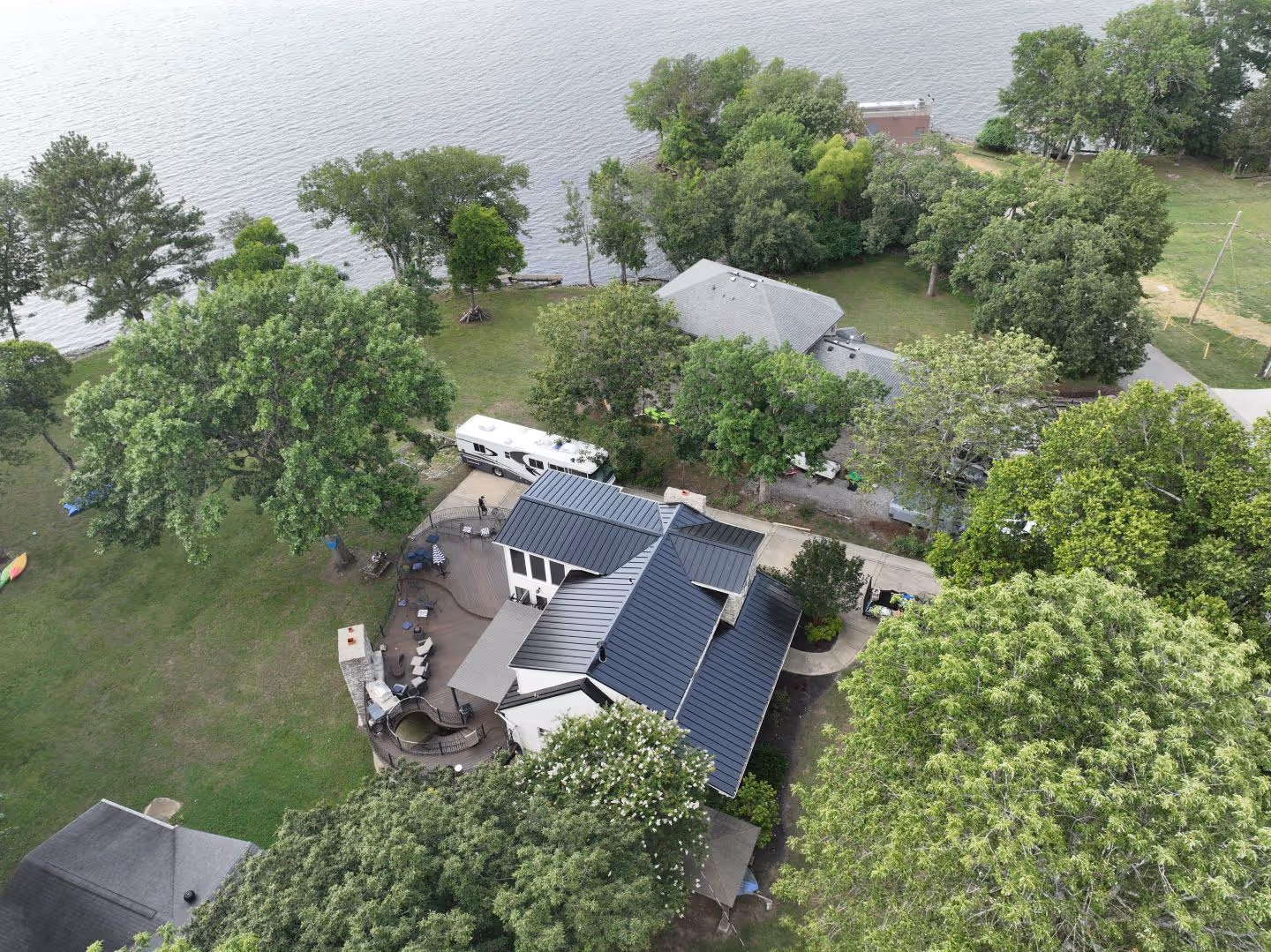 Mature trees frame the site and push shade across the roof through the day. Walks connect the terrace, the outdoor fireplace, and the shoreline. The plan is open and practical for the water, wide doors to the yard, and a layout that pulls the view straight through the house. The cupola-style cap near the peak becomes the marker from the lake.