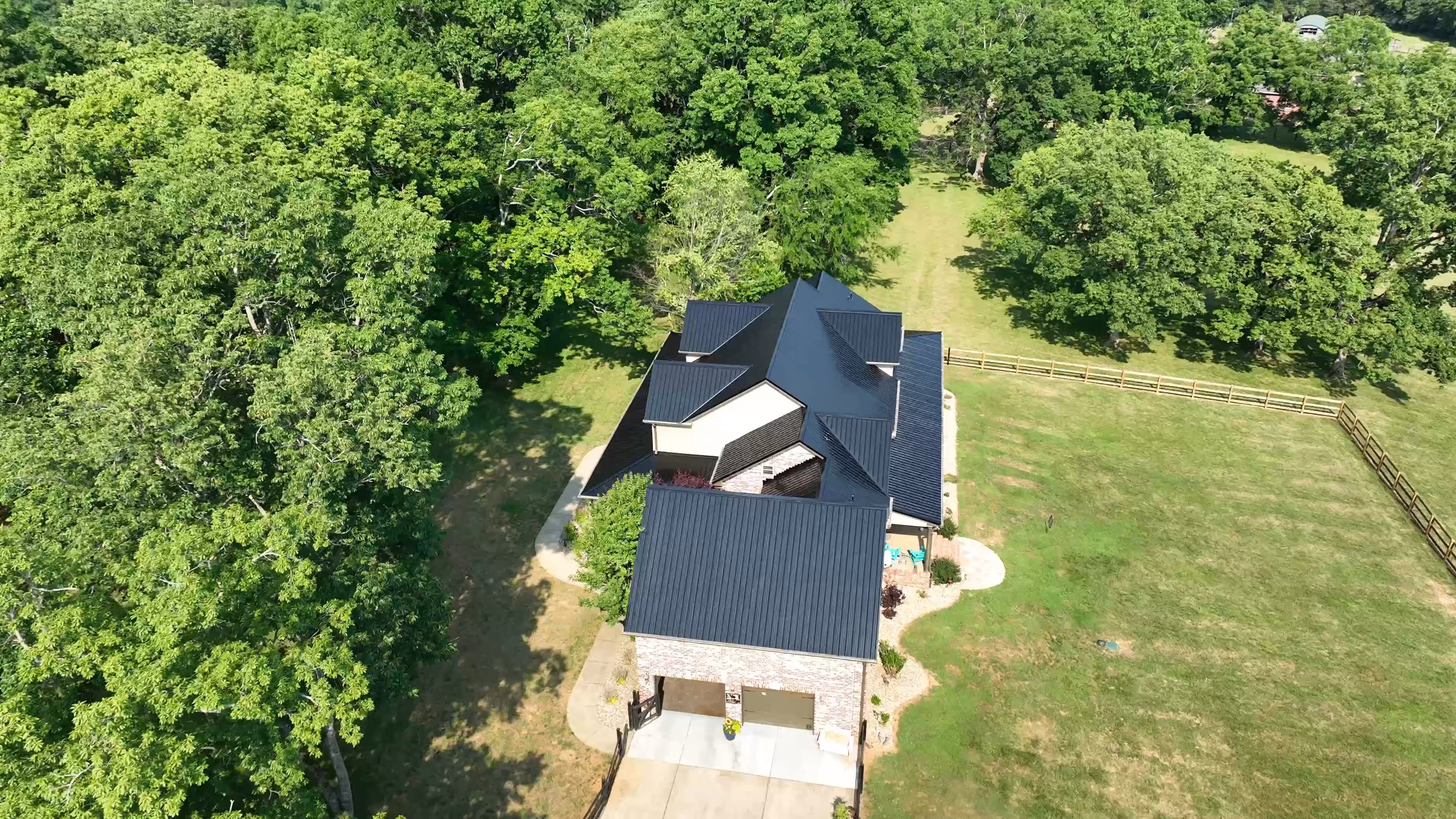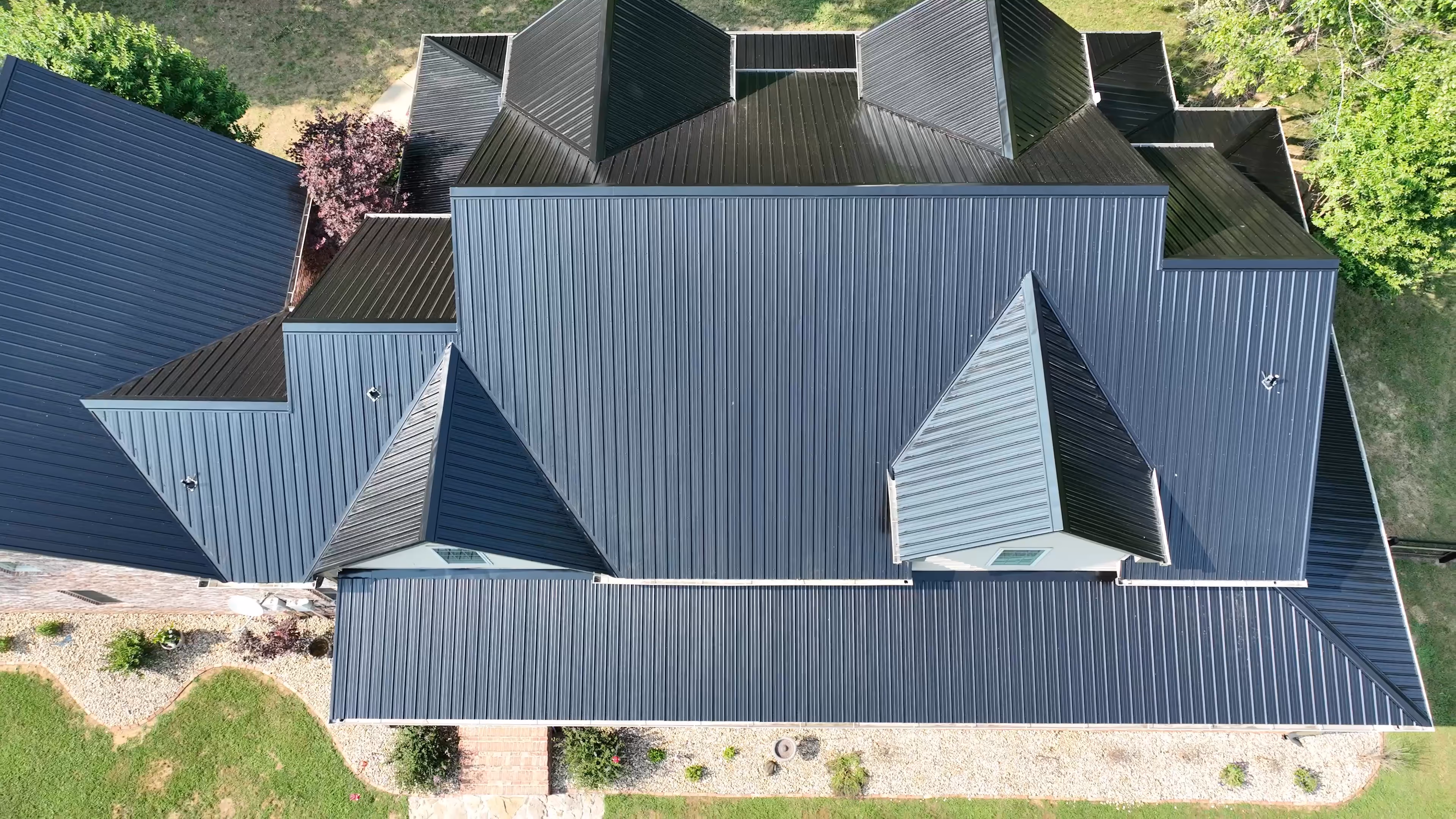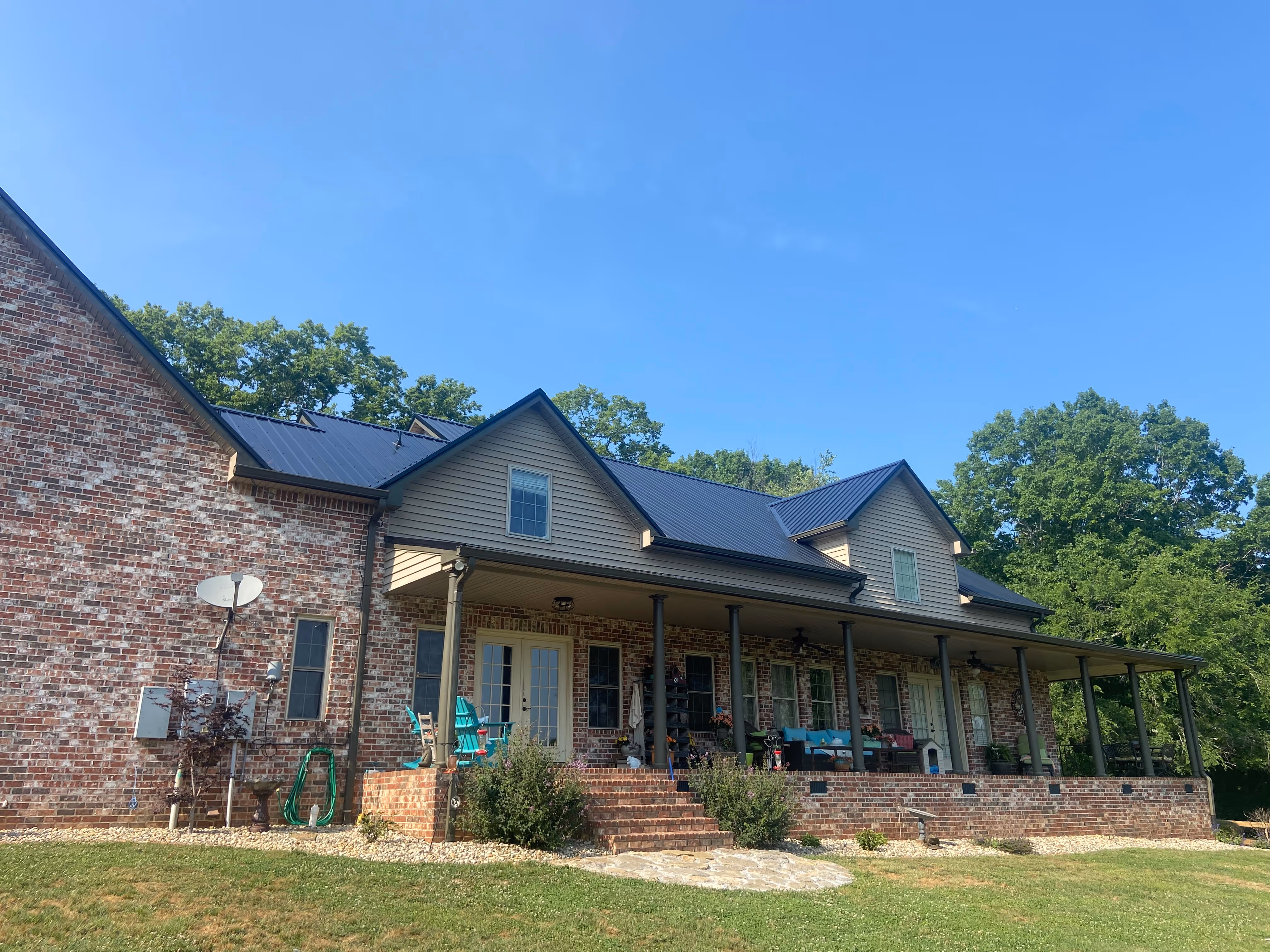 We installed a black classic-panel metal roof. Panels run full length from ridge to eave so the slopes read straight from any approach. Ribs align across the planes, ridges sit low, and rakes throw a crisp shadow that lines up with the porch posts. The porch roofs use the same panel and color, so the wrap looks like one system rather than add-ons. Gutters and downspouts are color matched so the trim stays clean.