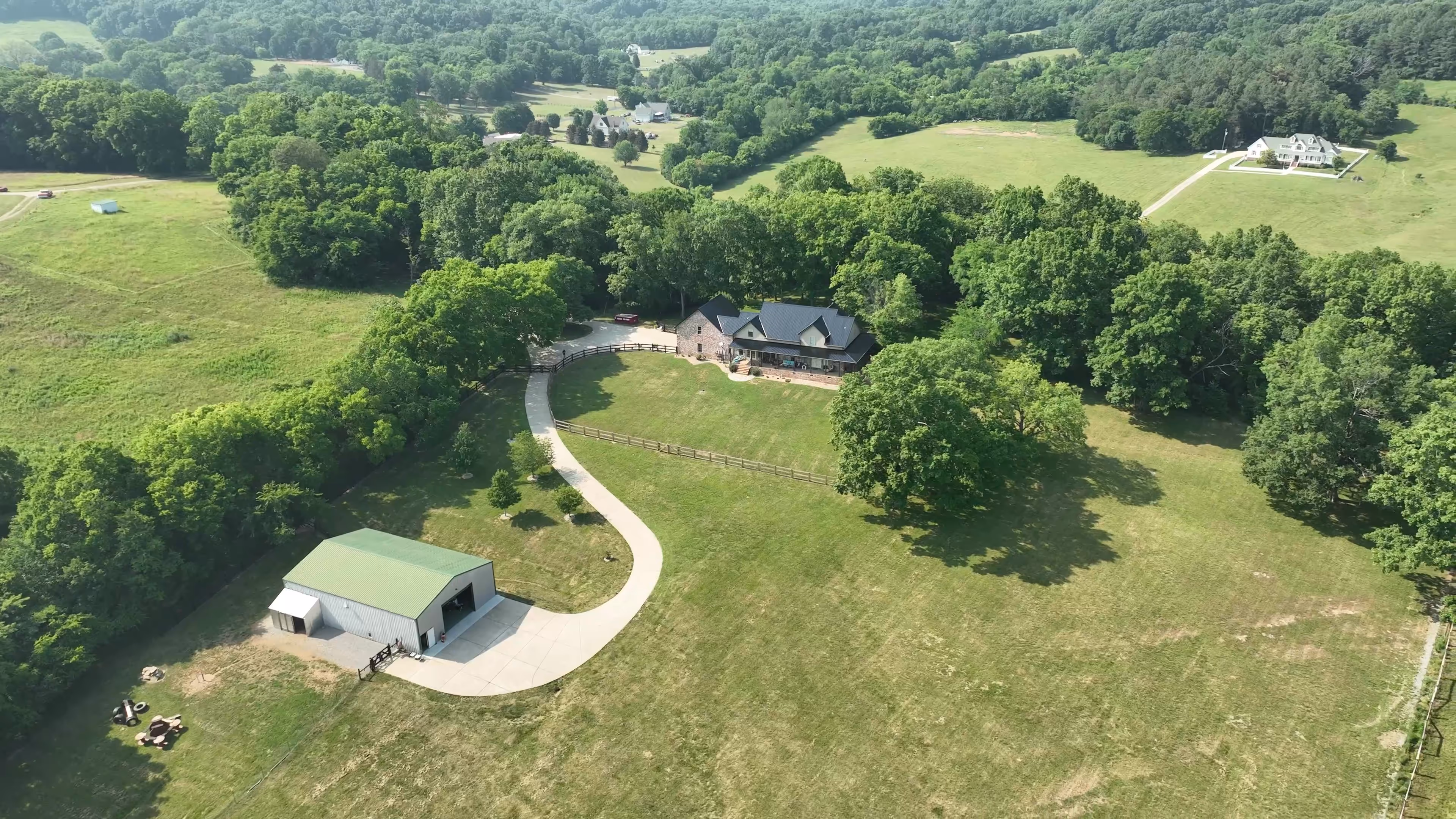 Around the sides the porch turns and drops into the trees, which helps the house sit into the site. Windows stay tall enough to match the brick base. Gable returns keep the ends neat, and the planting sits low so the rail and column rhythm stays visible. The setting is pasture and hardwoods. The black roof reads quiet and firm against that green backdrop.